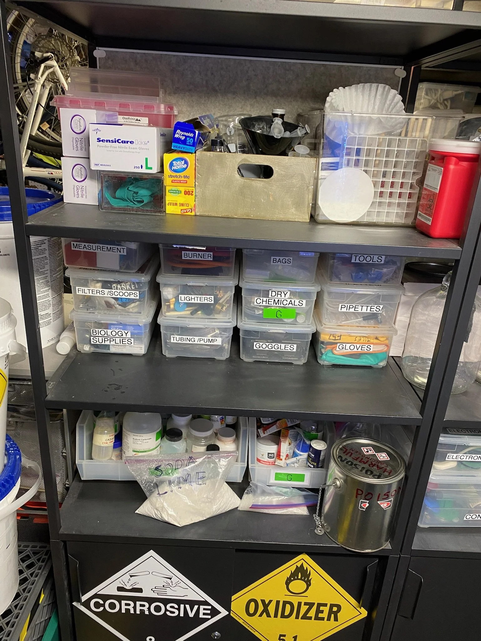 Every chemical is stored in labeled storage containers utilizing the Stanford EHS storage color and letter code standard.