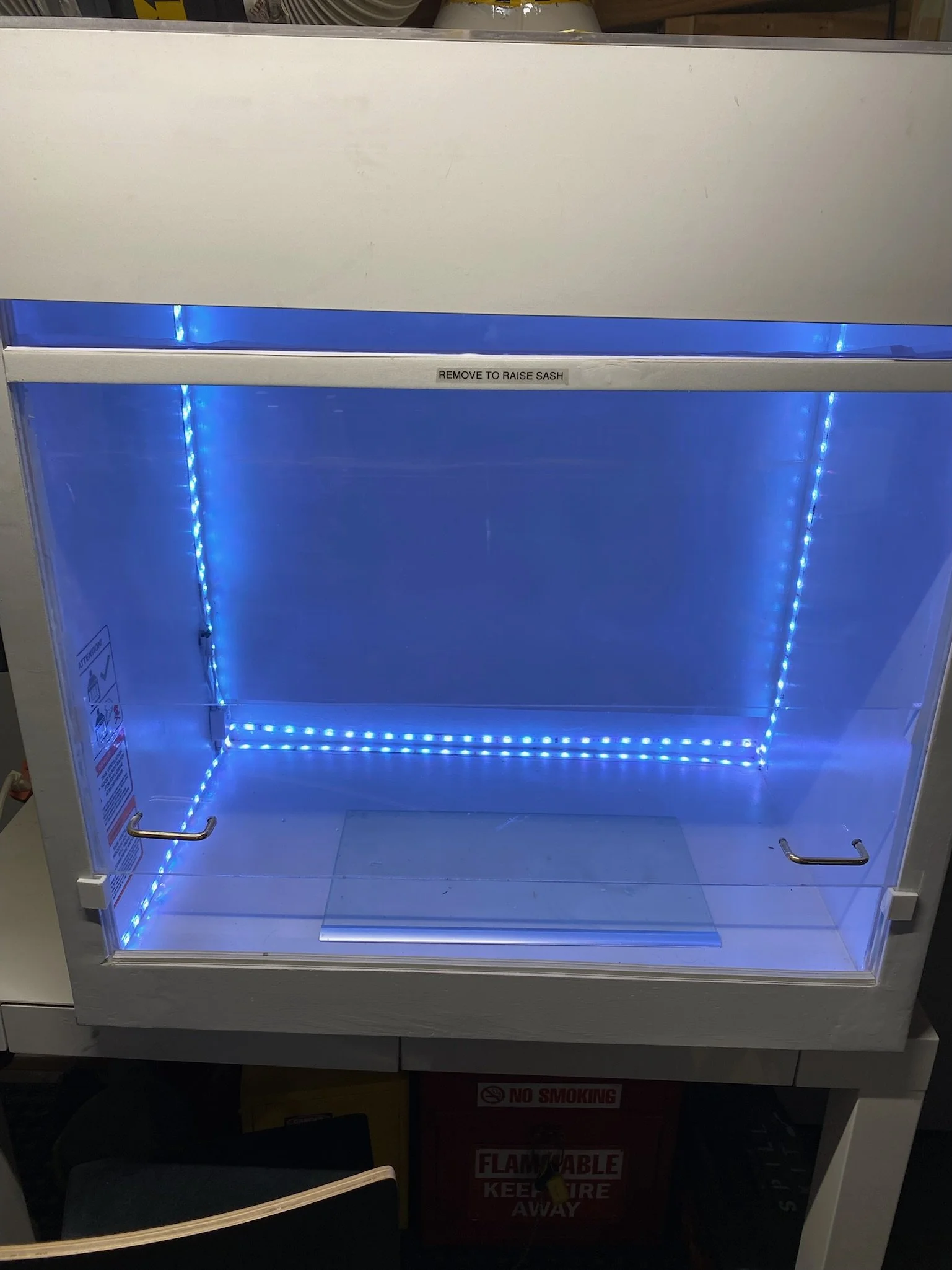 This fume hood utilizes carbon scrubbers to neutralize vapors before they exit outside the garage. The plexiglass windows have withstood impacts by exploding glassware and have proven to be adequate protection .