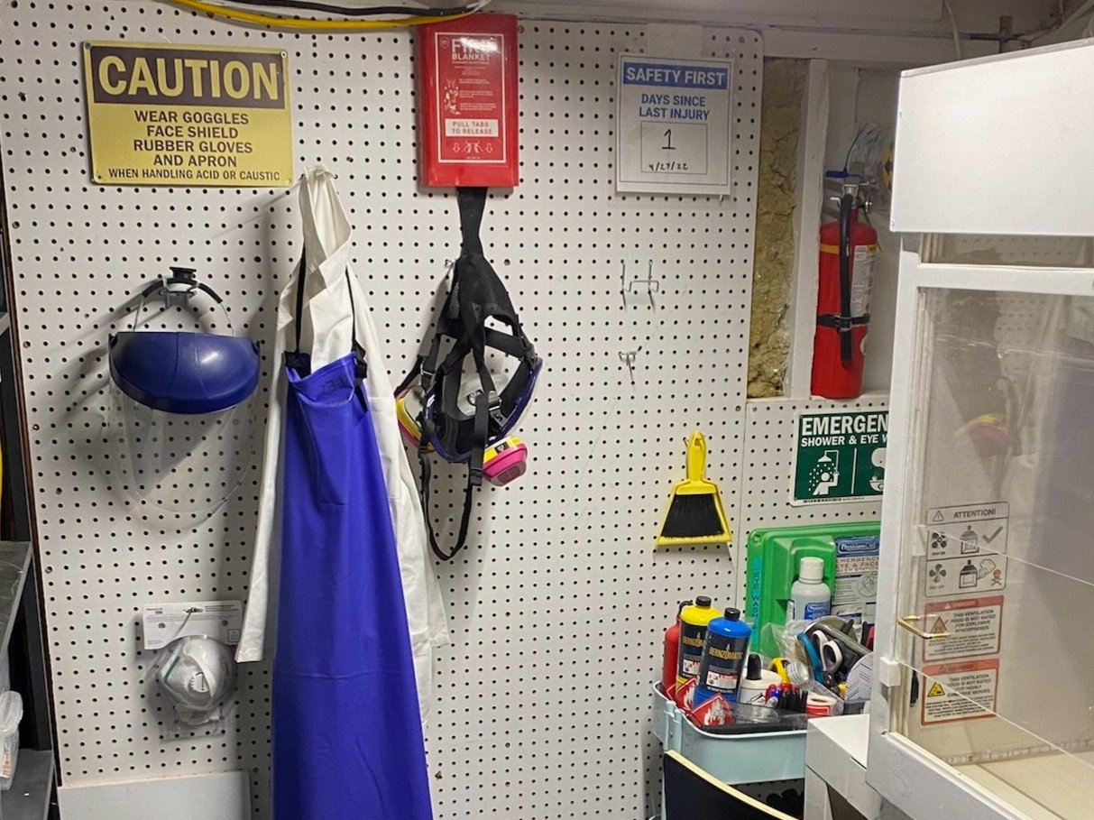 Wall mounted fire blanket and eye wash allow for quick reaction in emergencies