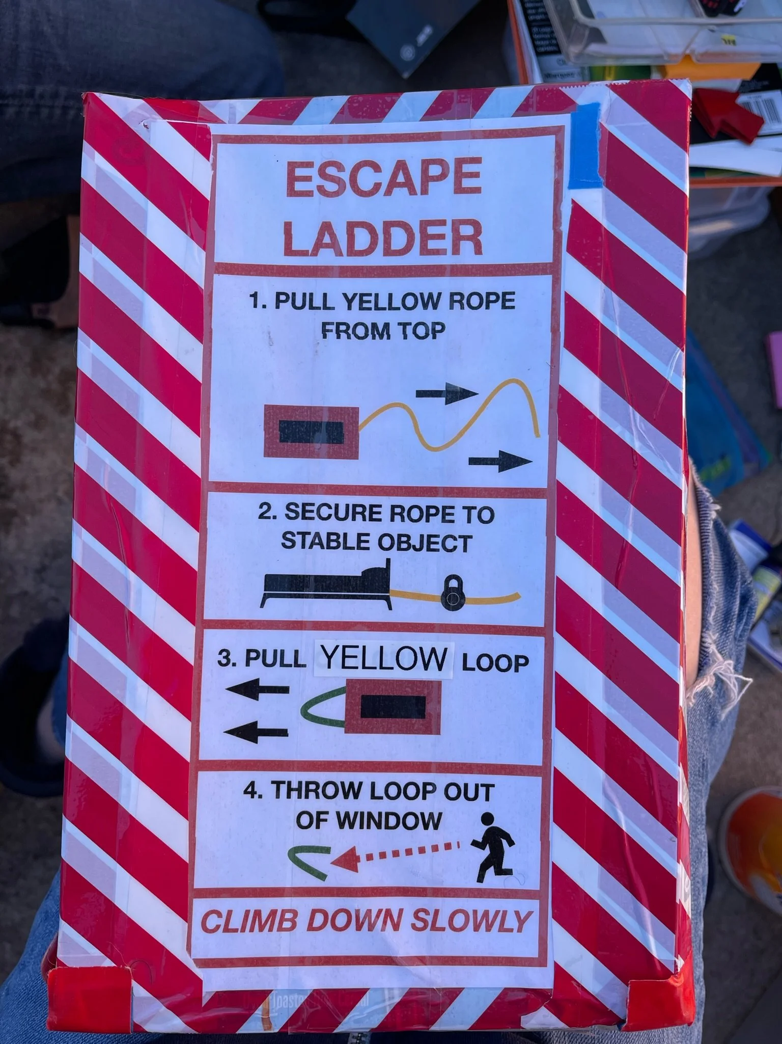 This contraption is a fire escape ladder for your bedroom made out of rope, garden hose, and a cereal box